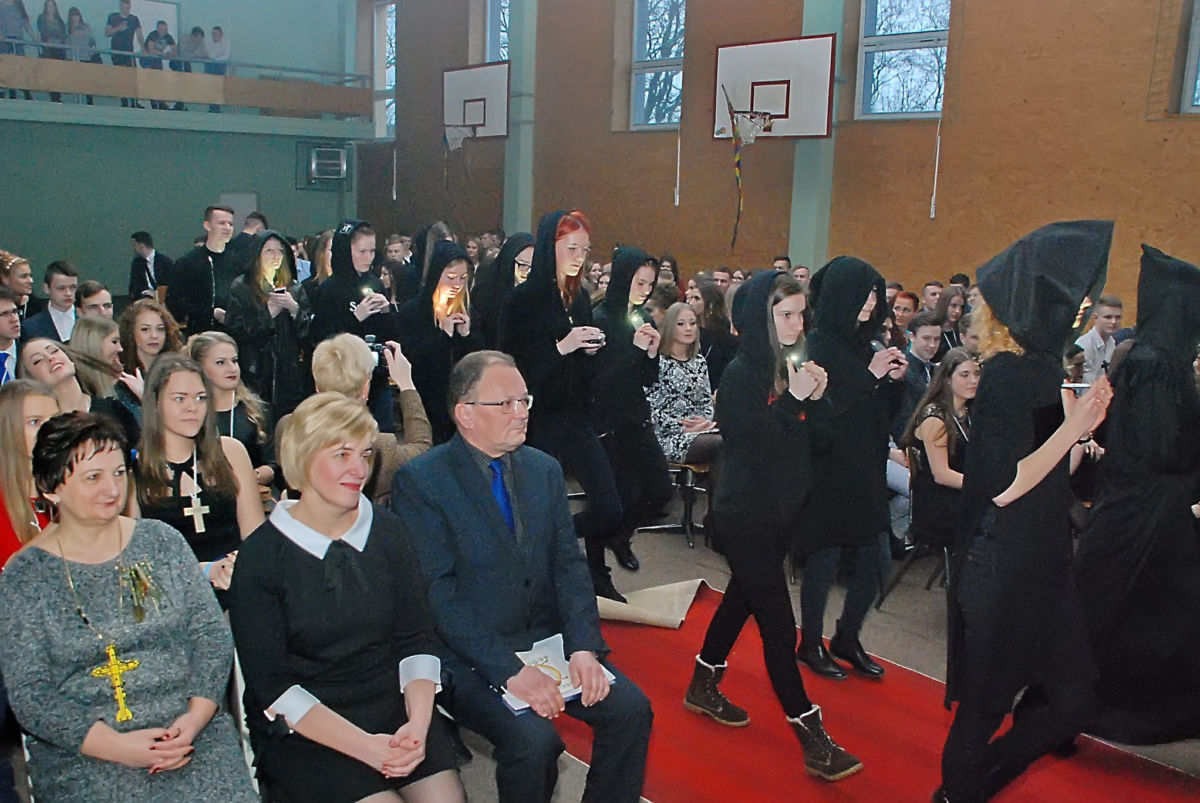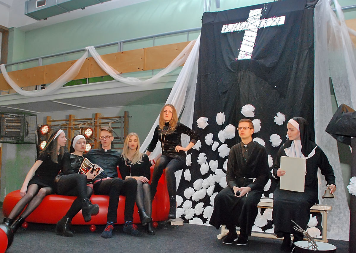 Visų pirma dvyliktokai rinkosi į savo klases, kad išklausytų auklėtojų patarimus, gražiausius linkėjimus. Na, o vėliau vienas po kito žengė į vienuoliktokų sukurtą vienuolyną. Vakaro temos idėja kilo ne šiaip sau: prisiminta, jog 1928 metais iš Vokietijos į Plungę atvykę kapucinai už Babrungo upės ant kalno savo lėšomis pastatė mokyklos rūmus, įrengė bendrabutį ir jame apgyvendino neturtingus mokinius. Jaunuolius mokė nemokamai, tikėdamiesi iš jų išauklėti vienuolius. Tad ir šį kartą peržvelgtos būsimųjų studentų 12 metų nuodėmės.