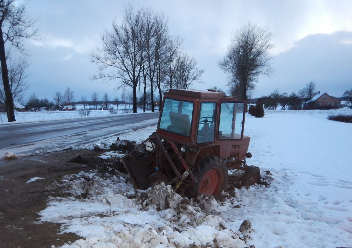 Tądien vienas po kito ėjusių eismo įvykių grandinę „uždarė“ vakarop, apie 17.50 val., kelio Kryžkalnis–Rietavas–Vėžaičiai 59-ajame kilometre griovyje atsidūręs traktorius T-25. Paaiškėjo, kad stumdydamas sniegą jis užklimpo. Apgadinimų nenustatyta.